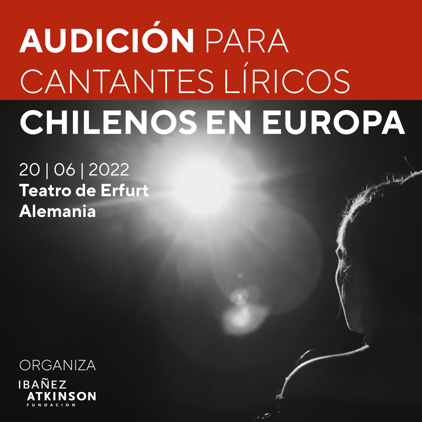 El lunes 20 de junio en Theater Erfurt, en la ciudad alemana de mismo nombre, cantantes de ópera nacionales podrán audicionar frente a un panel conformado por directores de casting de destacados teatros y casas de ópera de Europa y Norteamérica. Entre las instituciones que estarán presentes se encuentra Teatro Municipal de Santiago, Theater Erfurt, LA Opera, Canadian Opera Company, Hamburgische Staatsoper, Wuppertaler Bühnen, Staatstheater am Gärtnerplatz, Landestheater Detmold, Meininger Staatstheater, Oper Leipzig, Ópera de Oviedo, entre otras.